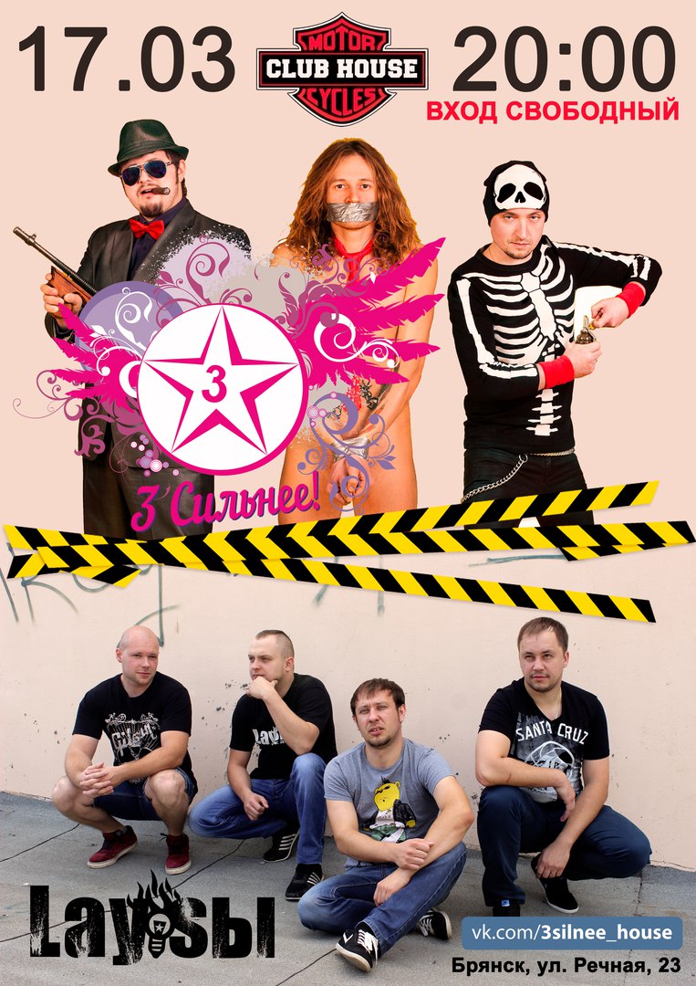 17 марта 2017 года Брянский бар CLUB HOUSE приглашает оторваться на концерт двух отвязных групп 3 СИЛЬНЕЕ! (Москва) и LAY'SЫ (Брянск).