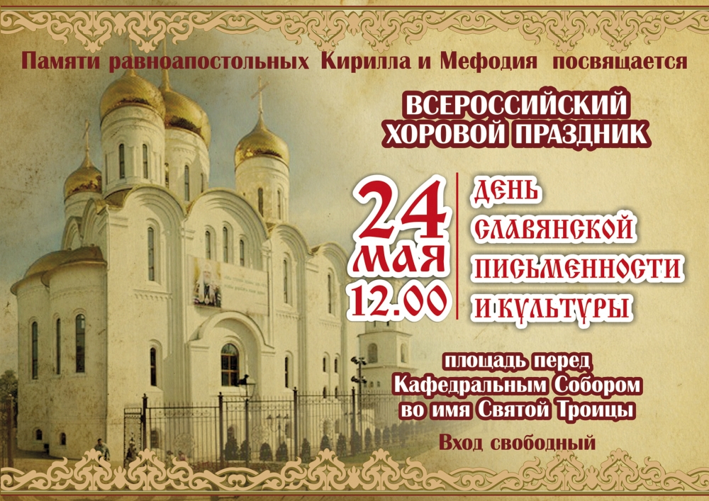 24 мая 2017 года на Соборной площади Кафедрального Собора во Имя Святой Троицы состоится хоровой праздничный концерт, посвященный празднованию Дня славянской письменности и культуры.