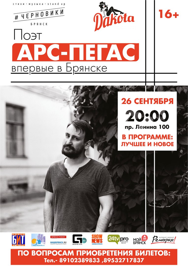 26 сентября 2017 года на сцене бара "Dakota" выступит одна из самых важных и почетаемых личностей - поэт из Москвы Арсений Молчанов, который более известен широкой аудитории под творческим псевдонимом Арс-Пегас.