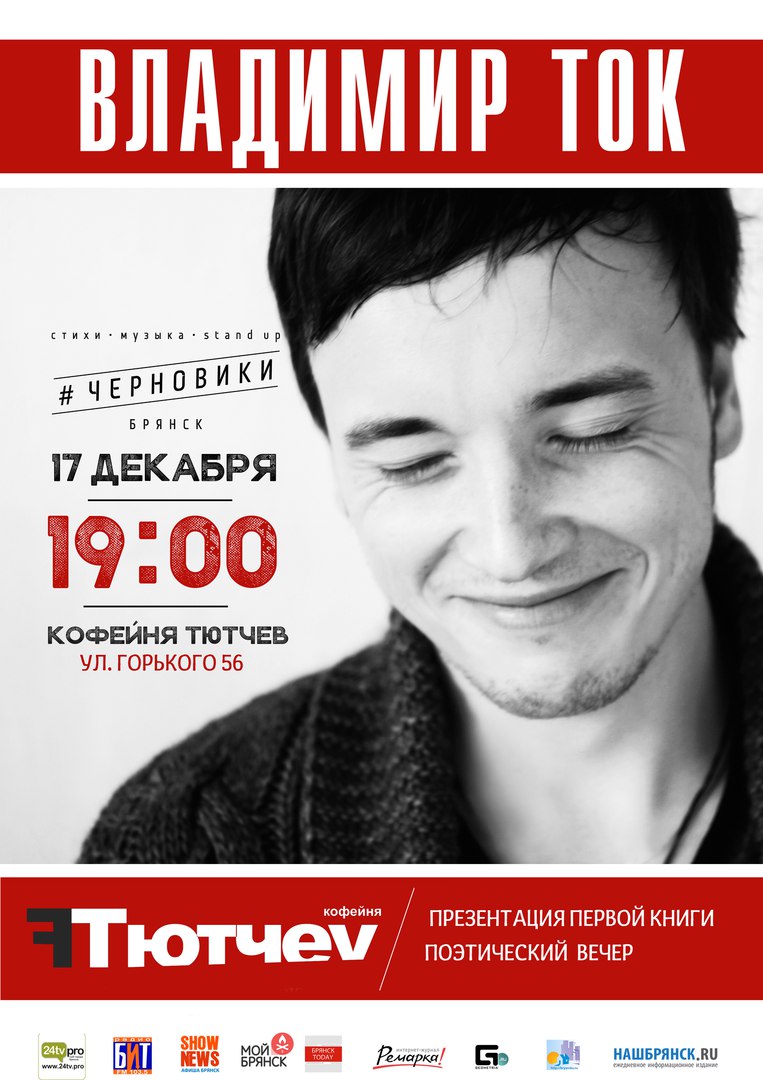 17 декабря 2016 года кофейня FТютчев города Брянска открывает двери поэзии на Поэтическом вечере талантливого Эстонского автора ВЛАДИМИРА ТОКА.